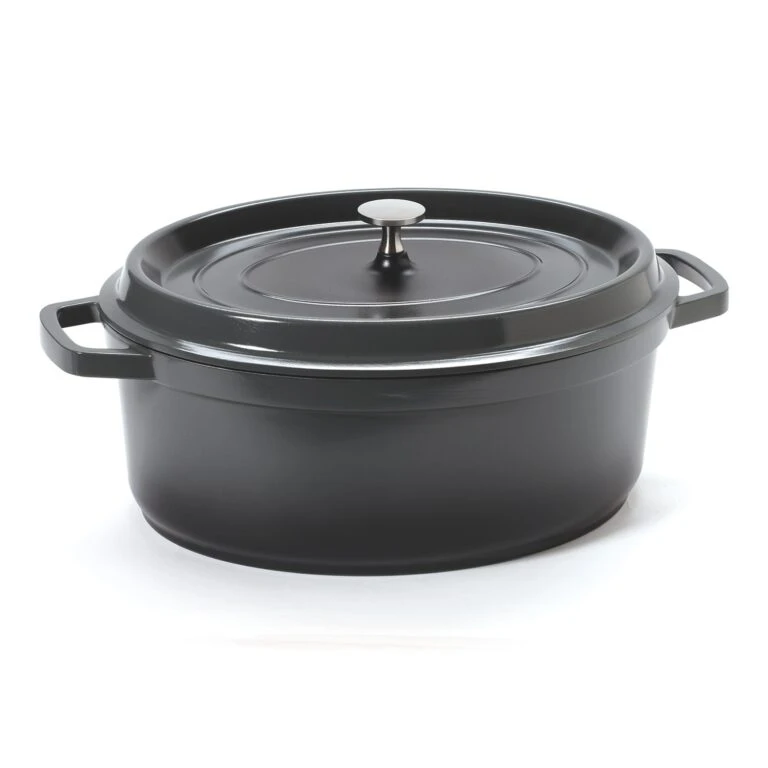 Cook with style and performance using the G.E.T. CA-007-GR/BK/CC Heiss Gray 6.5 Quart Oval Dutch Oven! This versatile and durable piece is perfect for slow cooking, braising, roasting, and more. With its sleek gray finish and even heat distribution, it’s as beautiful on the table as it is effective in the kitchen. Now available at a special promotional price—upgrade your cookware and bring home the perfect blend of function and elegance today!
