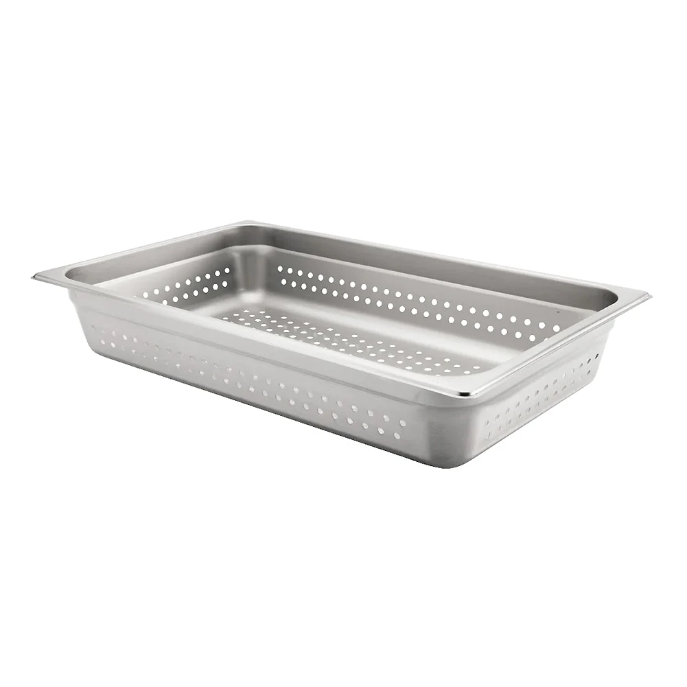 This full size perforated steam pan is 4″ deep and features reinforced edges and corners that resist bending.
