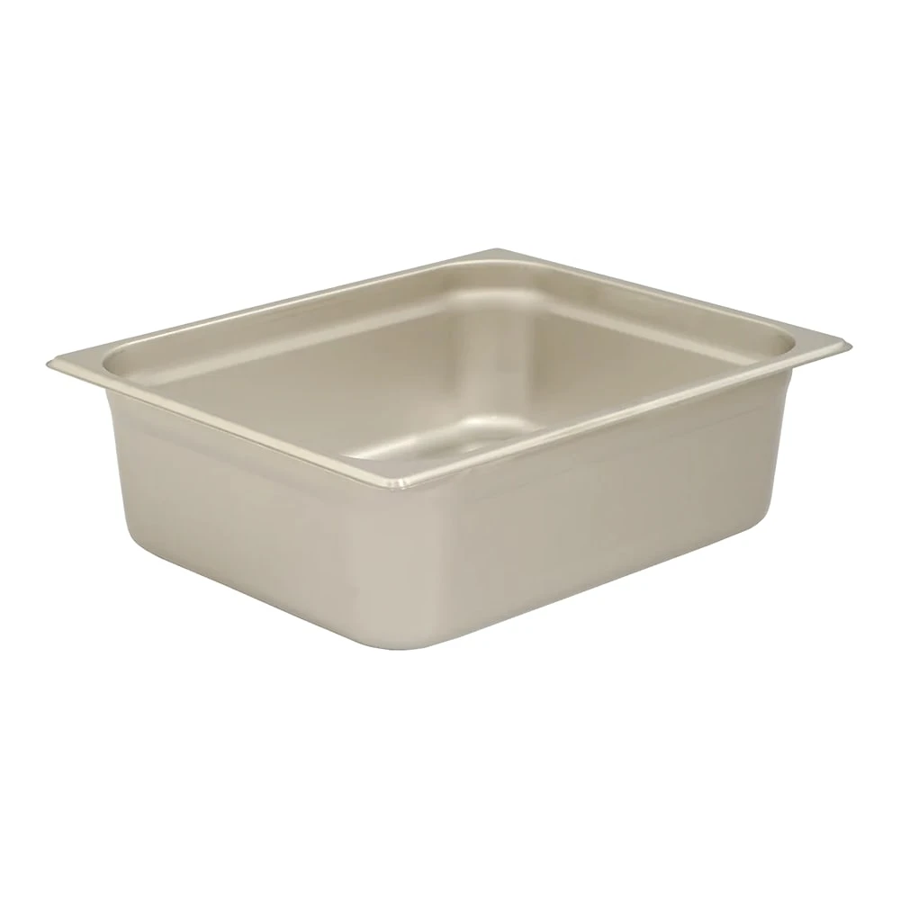 This half size steam pan is 4″ deep and features reinforced edges and corners that resist bending.
