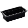 For serving, transporting and storing food all in one unit, use this black, 2‐1/2″ high, long half size food pan made of virtually unbreakable Camwear polycarbonate. This pan will not crack, bend or dent, and it withstands temperatures from ‐40°F to 210°F, making it good for both hot and cold food. The smooth, non‐stick interior makes cleaning easy, and also helps the pan stack neatly without sticking.
