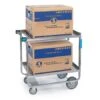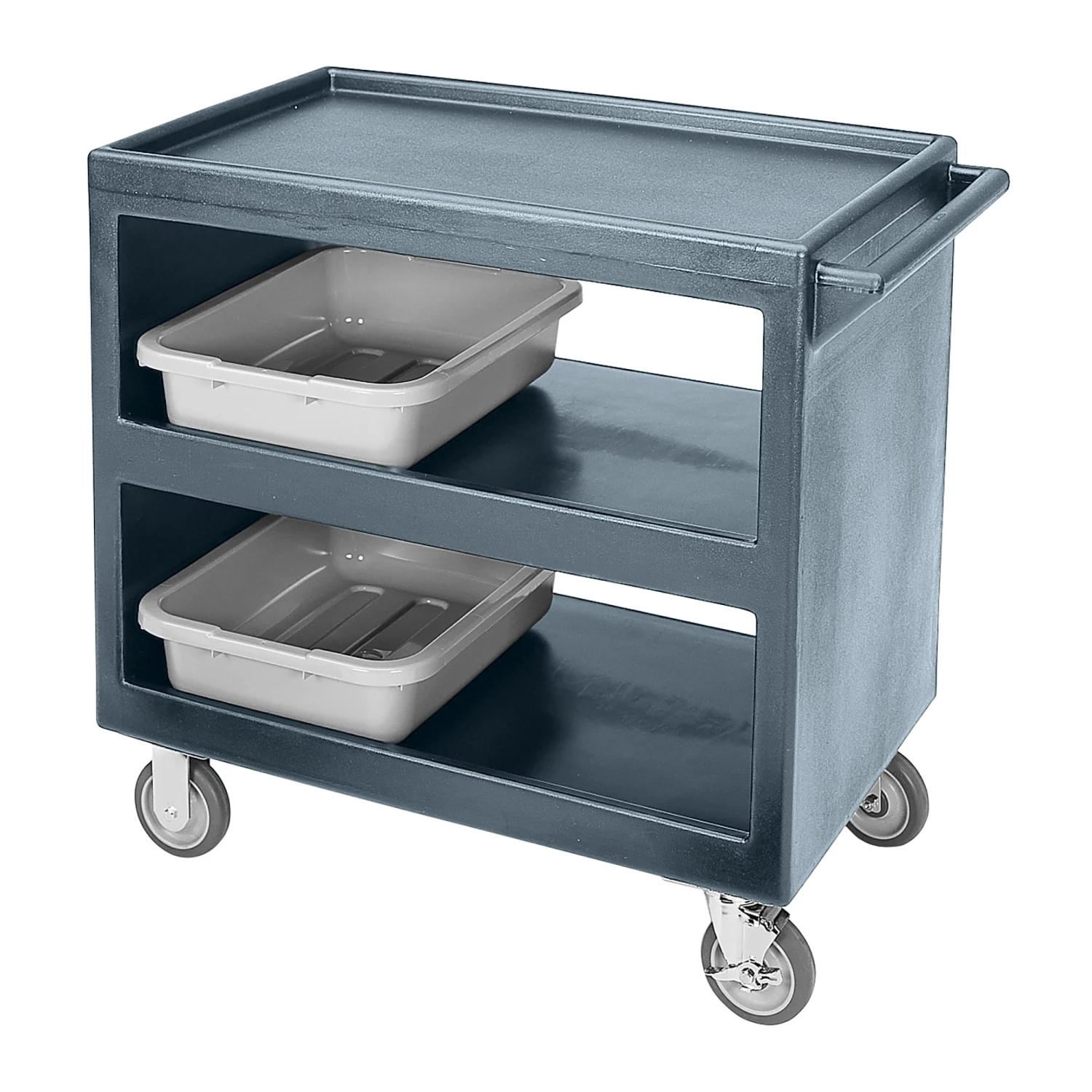 This versatile, granite gray cart is right at home in the dining room, stock room or loading dock; you can use it for bussing, materials transport, or just about anything else. The open‐sided, one‐piece design has molded in shelves and handles that can’t accidentally break off, and the whole cart is constructed of highly durable polyethylene.