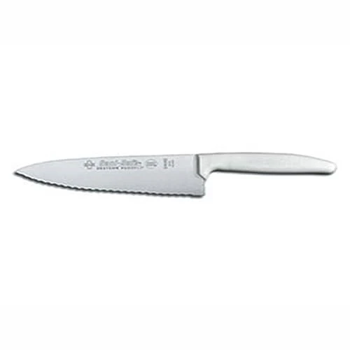 This Scalloped Cook’s Knife from Dexter Russell features a Sani-Safe handle which is a textured, slip-resistant, easy to clean polypropylene handle that withstands high and low temperatures. The impervious blade to handle seal provides the utmost sanitation and durability.