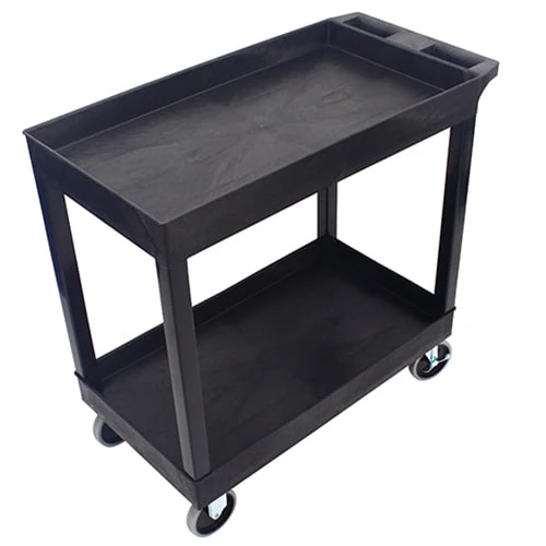 This Impact Products two shelf cart is perfect for transporting equipment, tools, and other heavy loads in any environment. Great for use in offices and restaurants. The structural foam construction will not rust, dent, chip or peel.