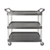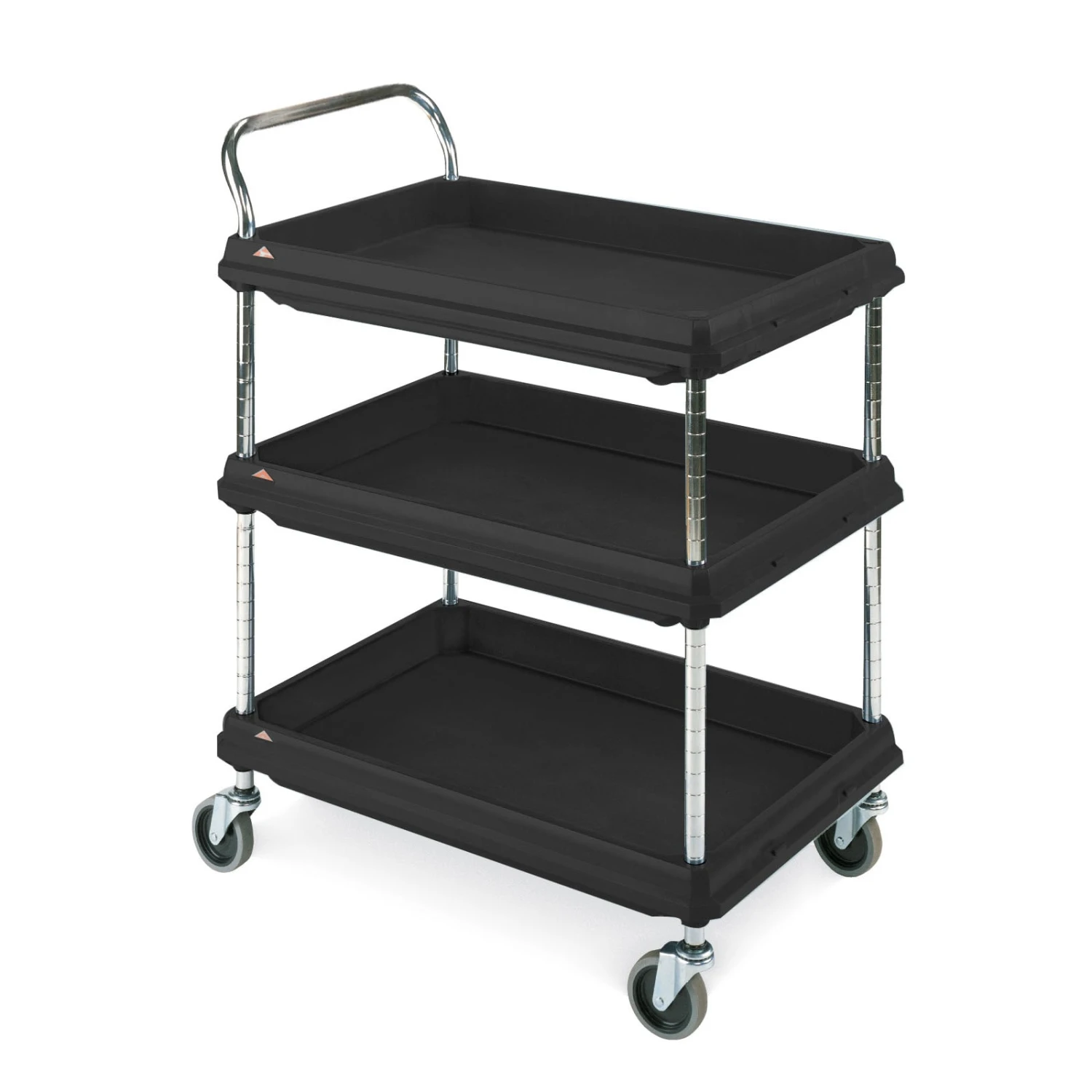 This Metro cart comes with 3 shelves. This cart has black polymer shelves that are adjustable and each shelf can hold up to 150 pounds.