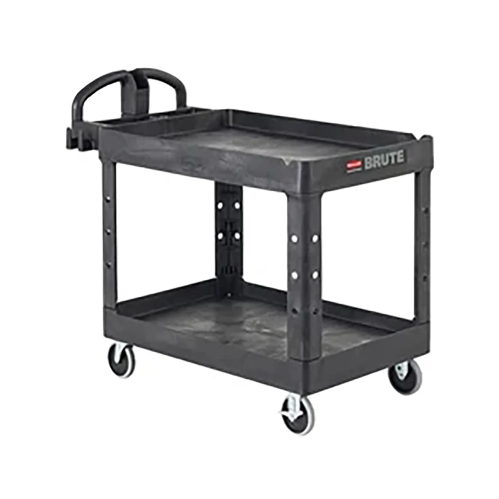 This black 2‐shelf utility cart features sturdy, lightweight structural foam construction that Will Not rust, chip, dent or peel, making it good for use in any work environment. It’s rounded corners protect your wall and furniture, and its large, non‐marking casters are easy on your floor and give the cart good maneuverability. Ergonomically designed push handle provides optimum hand placement and push height improving control and worker safety.