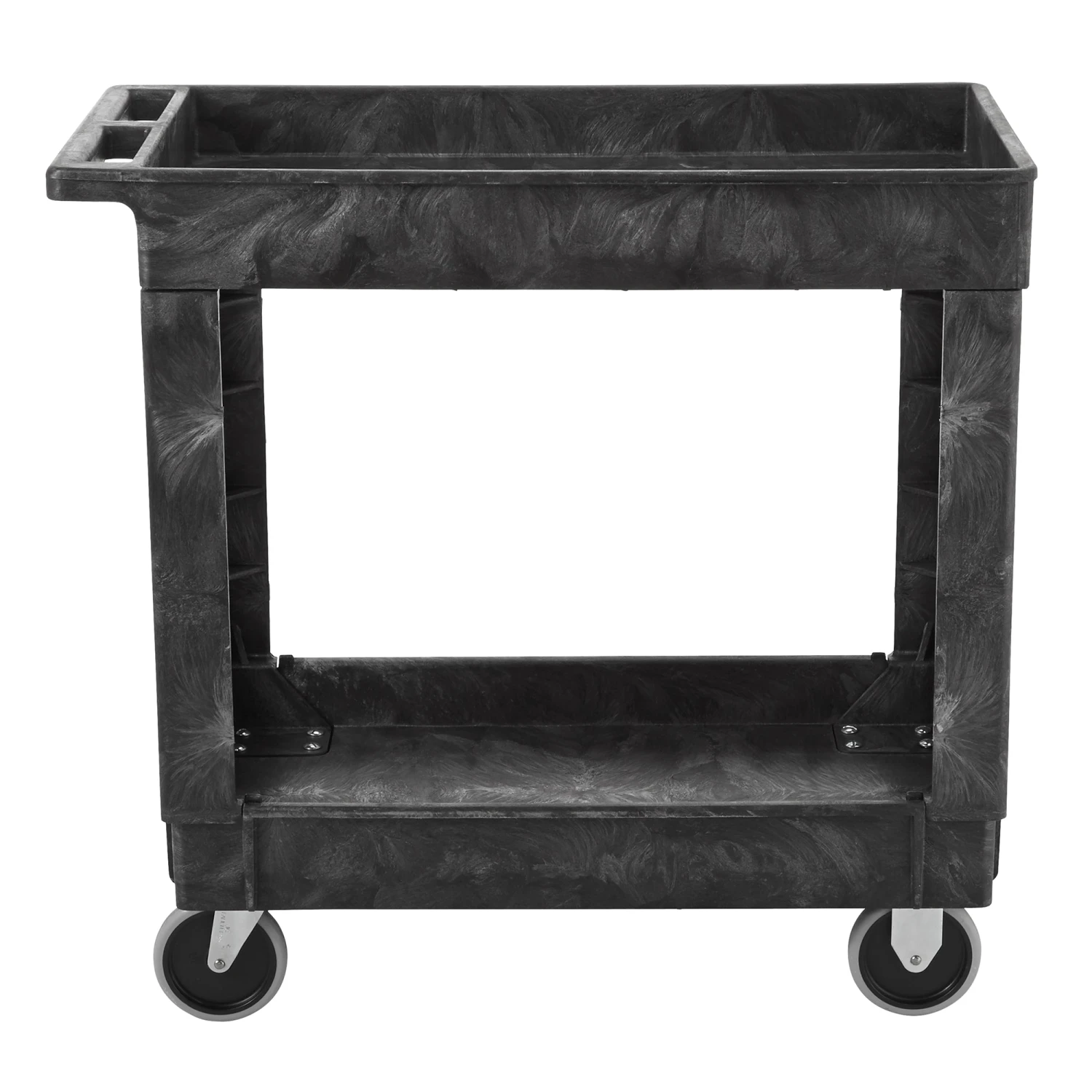 This black 2‐shelf utility cart features sturdy, lightweight structural foam construction that Will Not rust, chip, dent or peel, making it good for use in any work environment. It’s rounded corners protect your wall and furniture, and its large, 4″ non‐marking swivel casters are easy on your floor and give the cart good maneuverability.