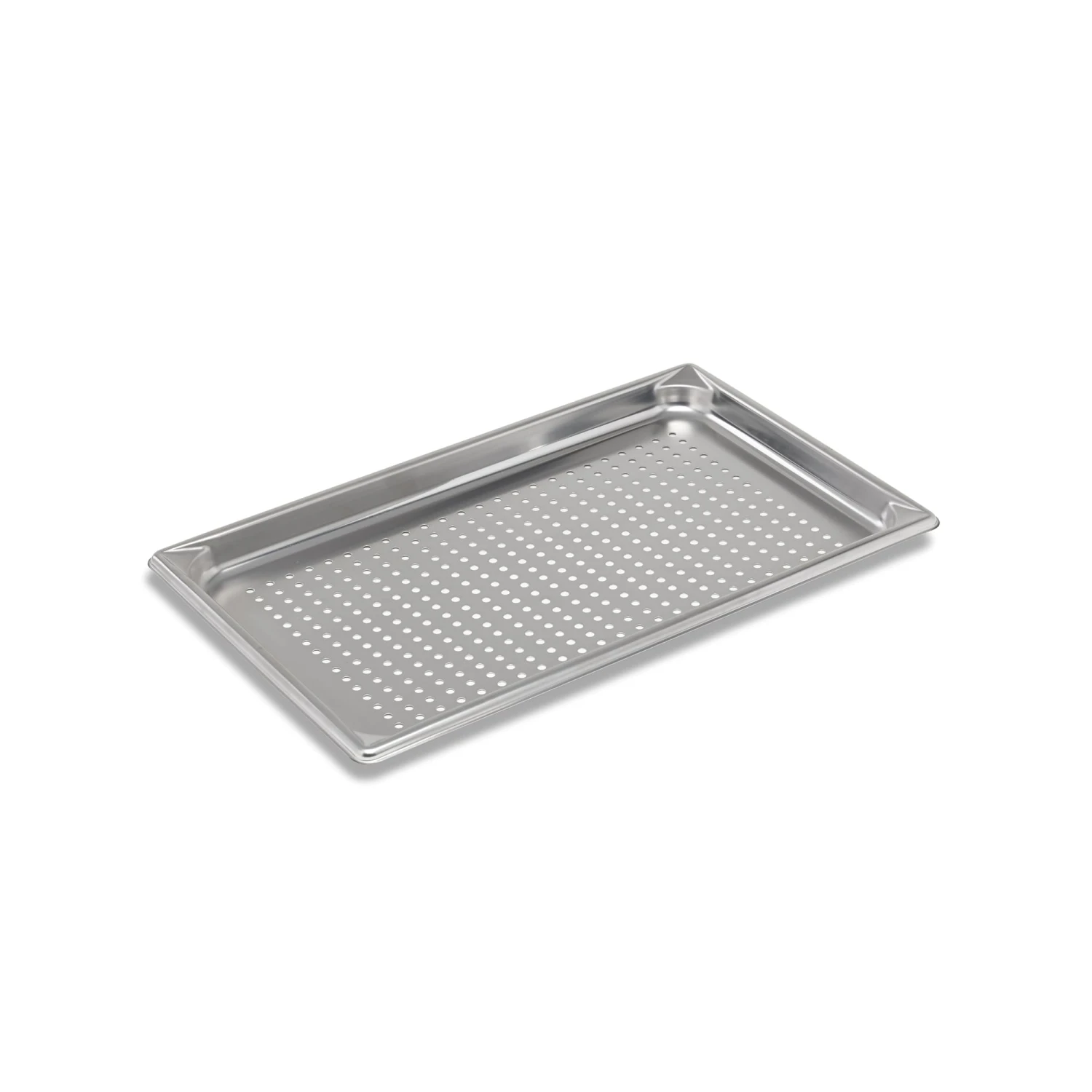 This full size perforated pan is made of stainless steel and is ideal for steaming or draining foods.