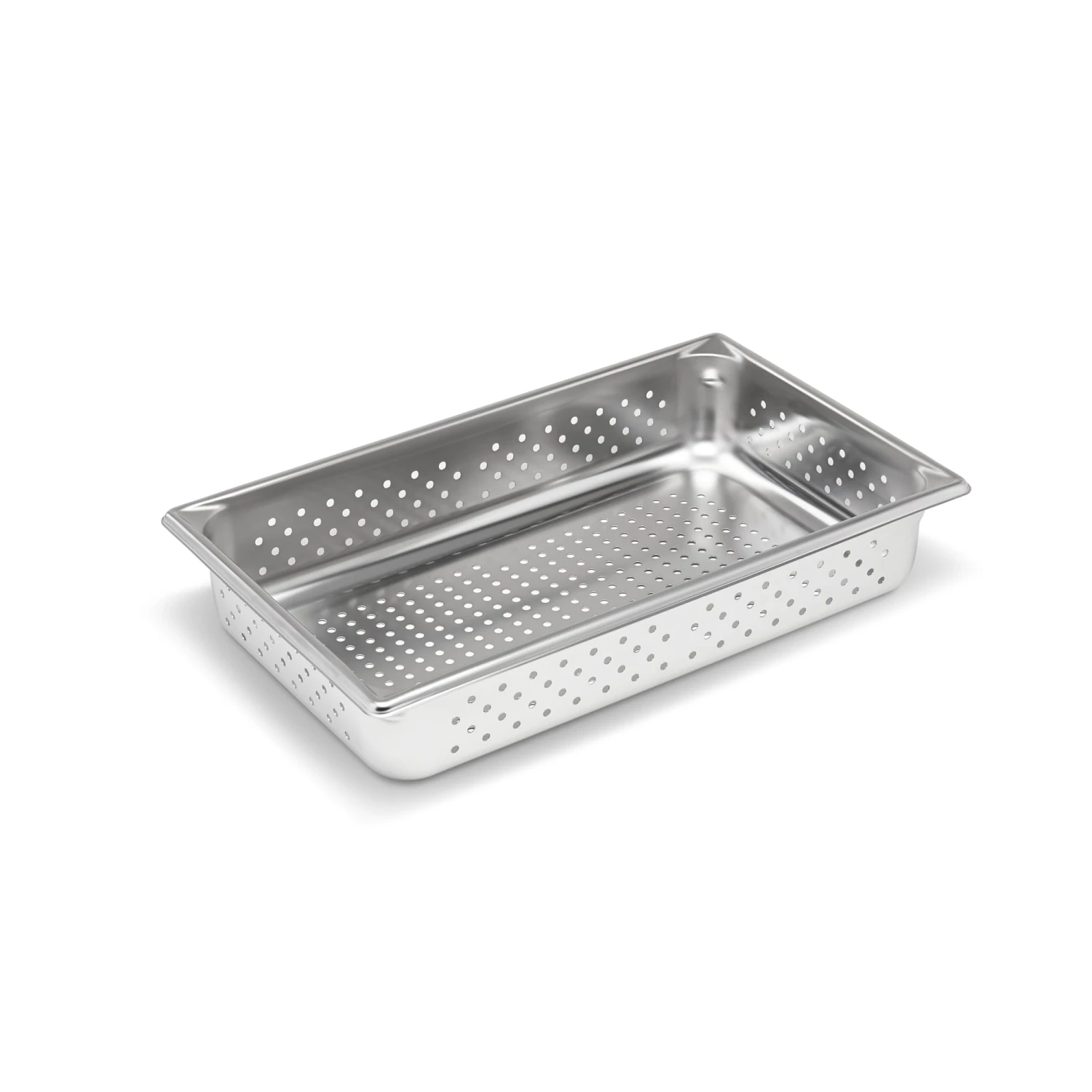 This full size perforated pan is made of stainless steel and is ideal for steaming or draining foods.