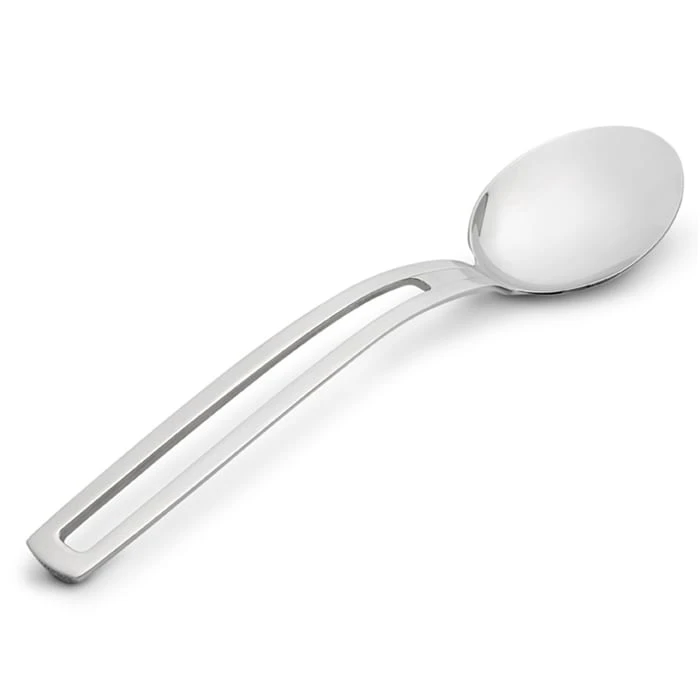 This Miramar® solid serving spoon from Vollrath® features an aesthetically pleasing appearance that is perfect for front-of-house use. This 11.4″ spoon has an ergonomic design that allows for a comfortable grip. The heavy-duty, cast stainless steel handle features an open design which dissipates heat so the spoon maintains a safe temperature.