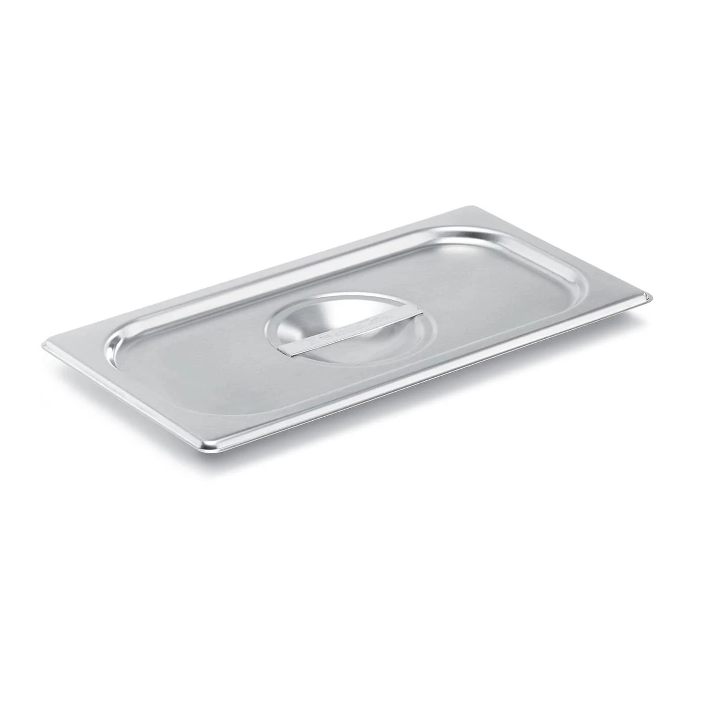 This Vollrath® 1/3 size solid cover is constructed out of durable 18-8 stainless steel. This cover is meant to be used with the 1/3 size Super Pan V®. It features reinforced edges which stay flat and fit securely, preventing spills and leaks. It is NSF Listed and made in the USA.