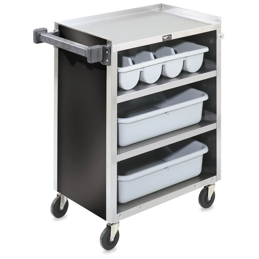 This 4 shelf bus cart allows you to hide the dirty plates and dishes because it is enclosed on four sides and the attractive vinyl adds some class and elegance.