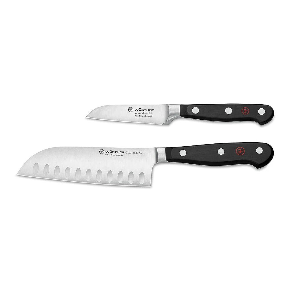 This 2‐piece mini Asian Knife Set from Wusthof is part of the Classic Collection and is precision‐forged from a single piece of an exclusive high‐carbon stainless steel. The new handle design is made of a highly durable synthetic material ‐ Polyoxymethylene (POM) ‐ which has a tighter molecular structure to resist fading and discoloration. This set includes a 3″ flat cut Paring Knife and a 5″ Santoku Knife with a hollow edge.